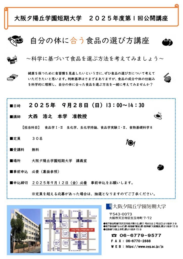 〒543-0073 大阪市天王寺区生玉寺町7-72 大阪夕陽丘学園短期大学図書館 公開講座係