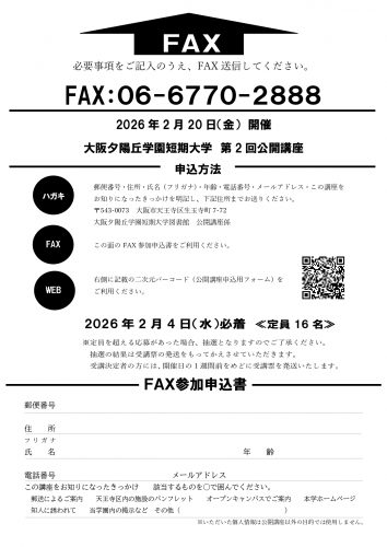 <FAX> 郵便番号・住所・氏名(フリガナ)・年齢・電話番号・メールアドレス・この講座をお知りになったきっかけを明記し、06-6770-2888までお送りください。